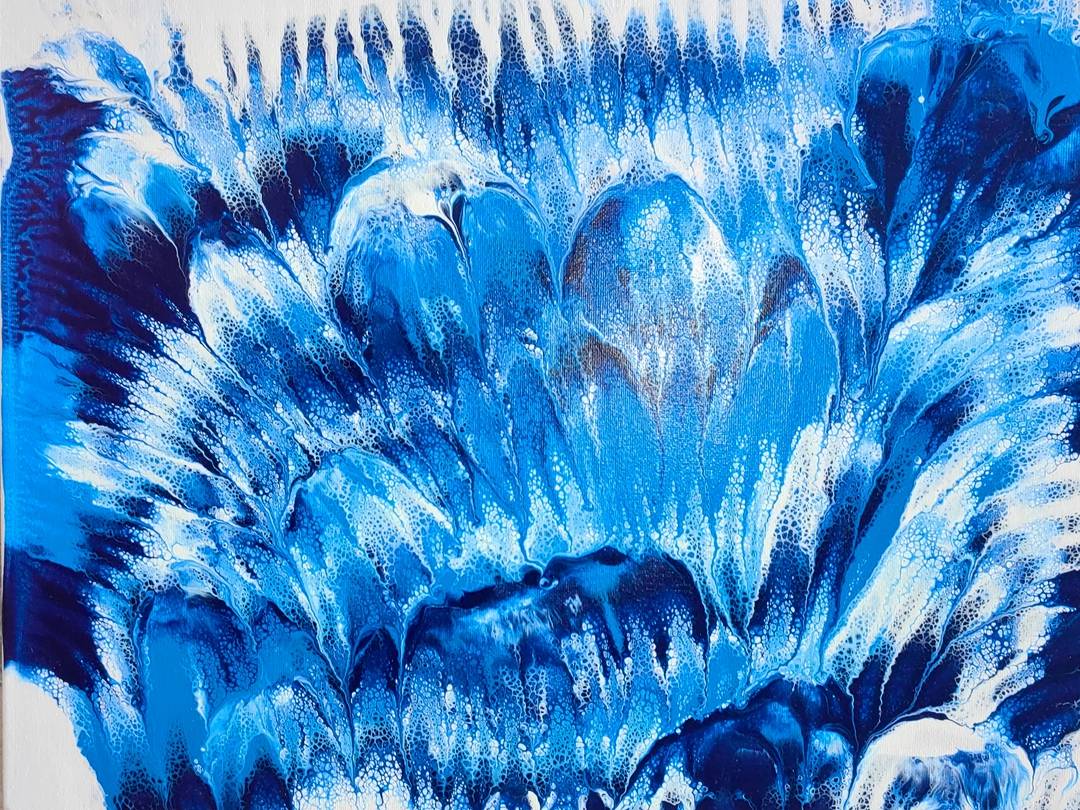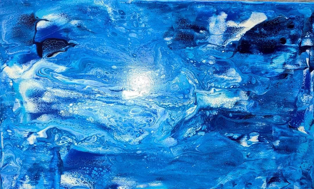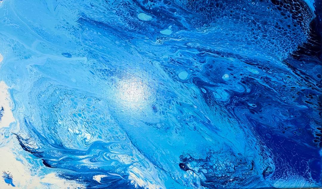 画面中,深邃的钴蓝与靛青构成基底,如同深海之下的静谧与神秘,沉淀着时间的厚重;局部泼洒的靛青与湖蓝,在明暗交织中形成流动的光感,模拟着海水折射阳光的粼粼波光,是海洋鲜活的呼吸。而偶尔穿插的乳白与银灰,并非简单的浪花复刻——它们以细碎的笔触、朦胧的晕染,时而如雾霭笼罩的海面,时而如泡沫消散的瞬间,赋予画面虚实相生的诗意。