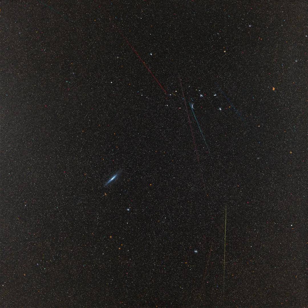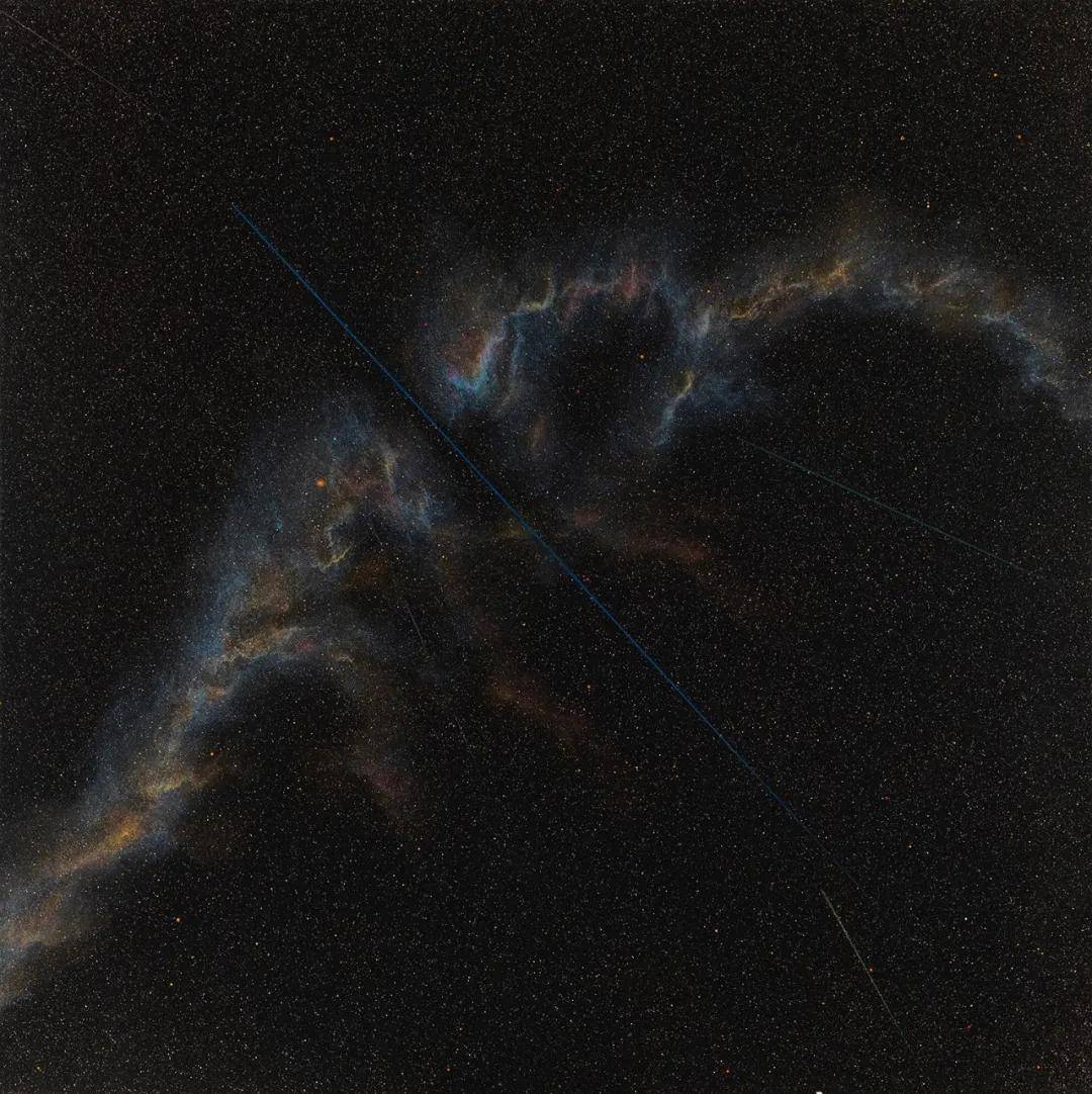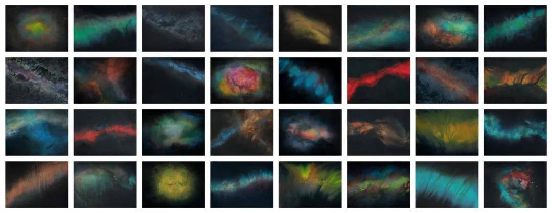 “星丛”系列、“要有光”系列、“无人区”系列的作品分别以仰视、平视、俯视的视角构成,就像一个“造物主”或外星高维生命在规划和营造着这个世界。在“星丛”系列中,他将不同的天体、星系、空洞等进行时空叠加,布满整个画面,建构一个万物互联、无限扩张、奥妙幽暗的“意象化宇宙图景”。如同人类大脑的神经元组织、微观世界粒子的运行规律与人工智能的链接关系一样,三者实际上有着及其相似的特征,似乎我们的世界是高维意识精心编辑的。同时,要有光系列的声光电气、星丛系列的破碎虚空、无人区系列的荒芜万象,犹如宇宙本体的演化史。由古希腊的宇宙本体自然要素与东方的五行及易经说,中世纪神创的万物有灵与东方的道法自然思想,近代人文主义人定胜天的意志及人类通向未来的科学世……由这几个系列作品呈现出来。