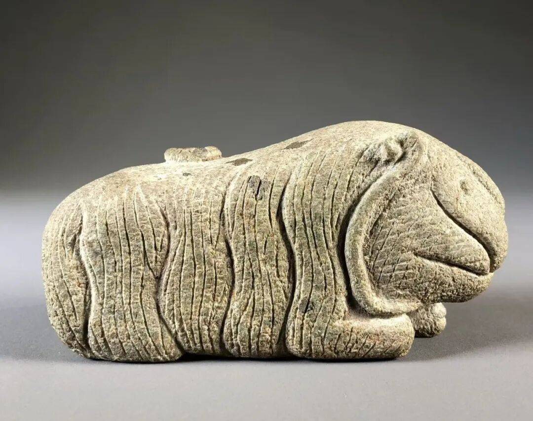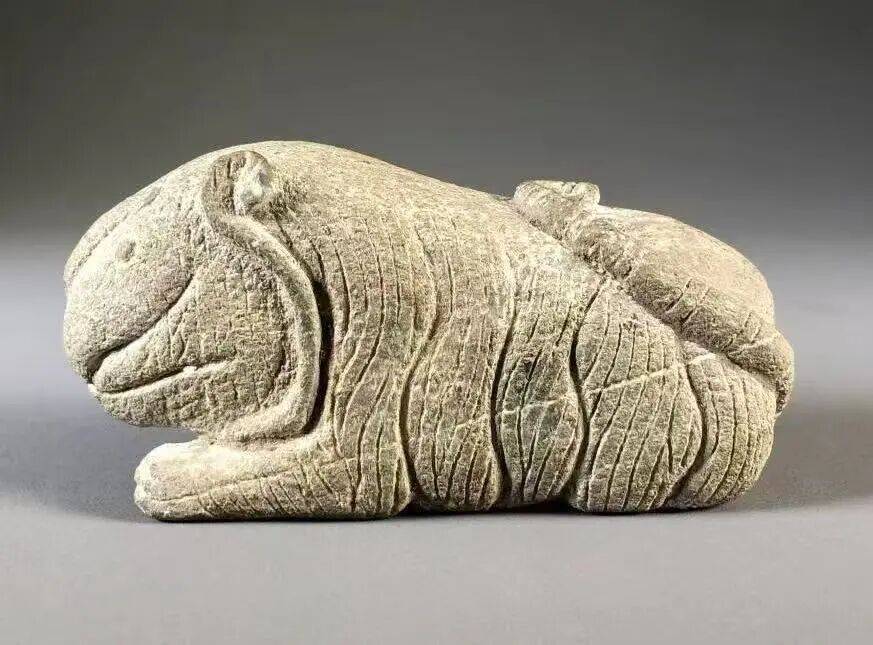 尺寸:长13.8厘米。高:9厘米。简介:雕虎以天降石陨石雕塑伏卧之姿,朴拙中见狞厉。匠人以大刀阔斧的竖纹摹虎毛,极简刻线勾眉眼口鼻,舍具象而抓神髓,将先民对虎的敬畏凝于天降陨石中。石面风化痕迹与雕纹相融,更添岁月厚重,是原始雕刻艺术中以石寄魂的经典之作。
